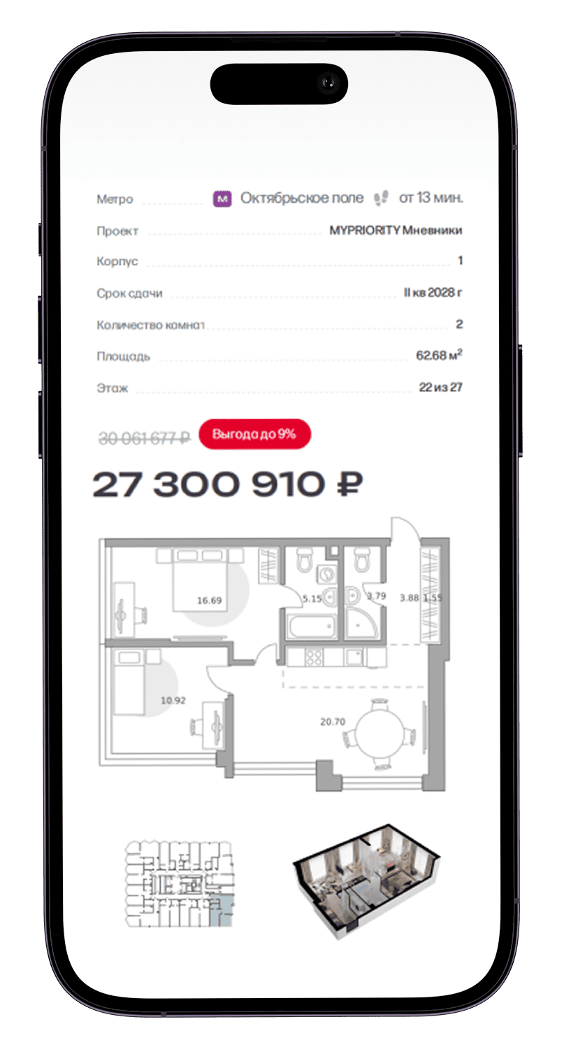 MYPRIORITY Мневники расположен в престижном районе Хорошёво-Мнёвники — одном из самых зелёных и экологичных районов Москвы. Здесь удачно сочетается близость к центру (всего 15 минут до Садового кольца) и уникальное природное окружение: Москва-река и заказник «Серебряный бор» В шаговой доступности находятся станции метро «Октябрьское поле», МЦК «Зорге», что позволяет быстро добраться до ключевых деловых и культурных центров столицы.